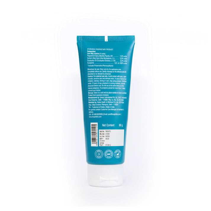 Composition (% w/w): Each 80g contains: Peppermint Satva (Mentha Piperita, AP) - 7.0% w/w, Kumari (Aloe Vera) (Aloe Barbadensis, Lf.) - 5.0% w/w, Eucalyptus Oil (Eucalyptus Globulus, Lf. Oil) - 3.0% w/w, Excipients - Q.S. to 100% w/w * Includes Preservative Phenoxyethanol